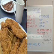 2 pieces cod, 3 pieces perch, and smelt. Served with soup, salad or coleslaw, and potato.